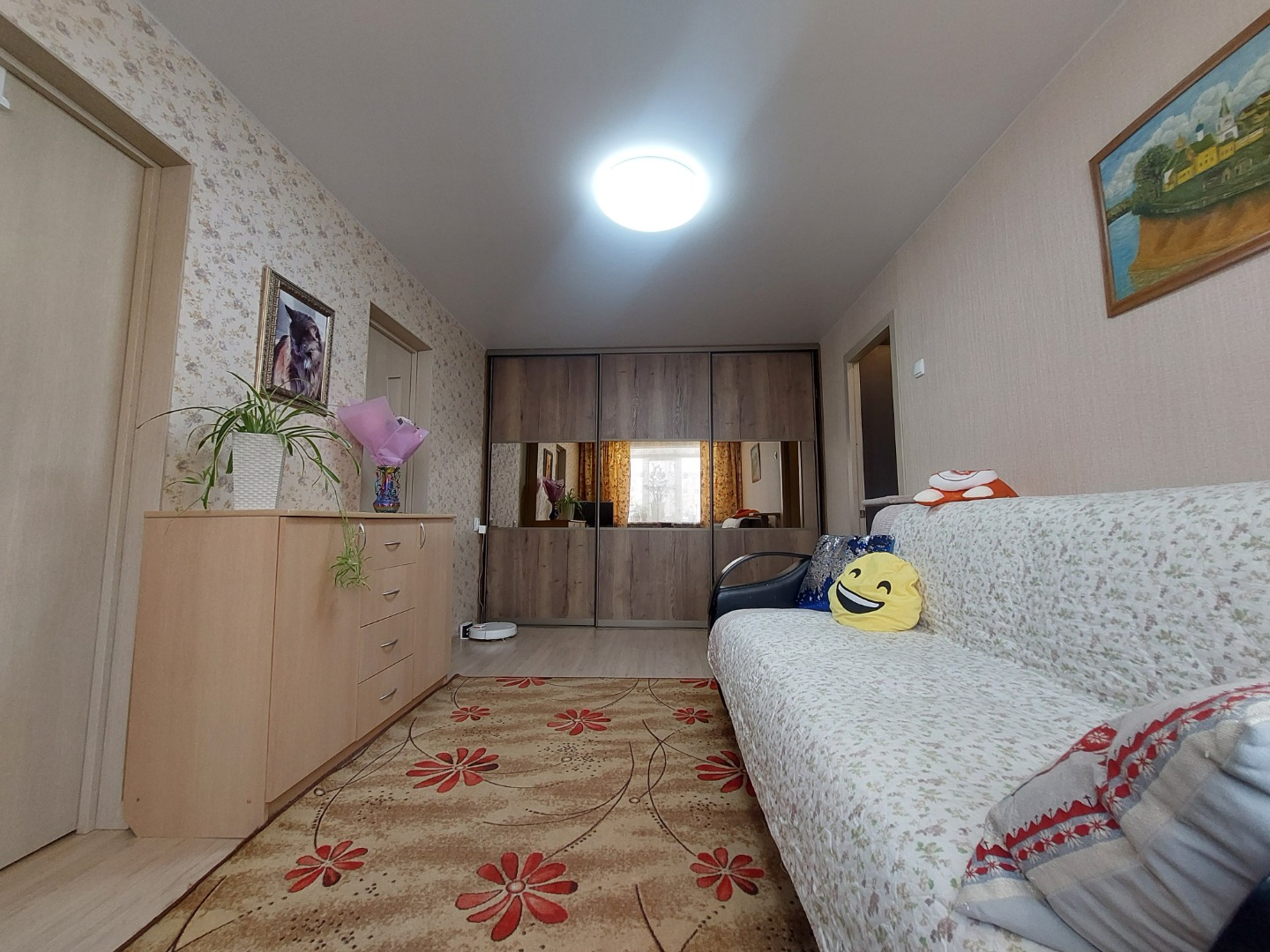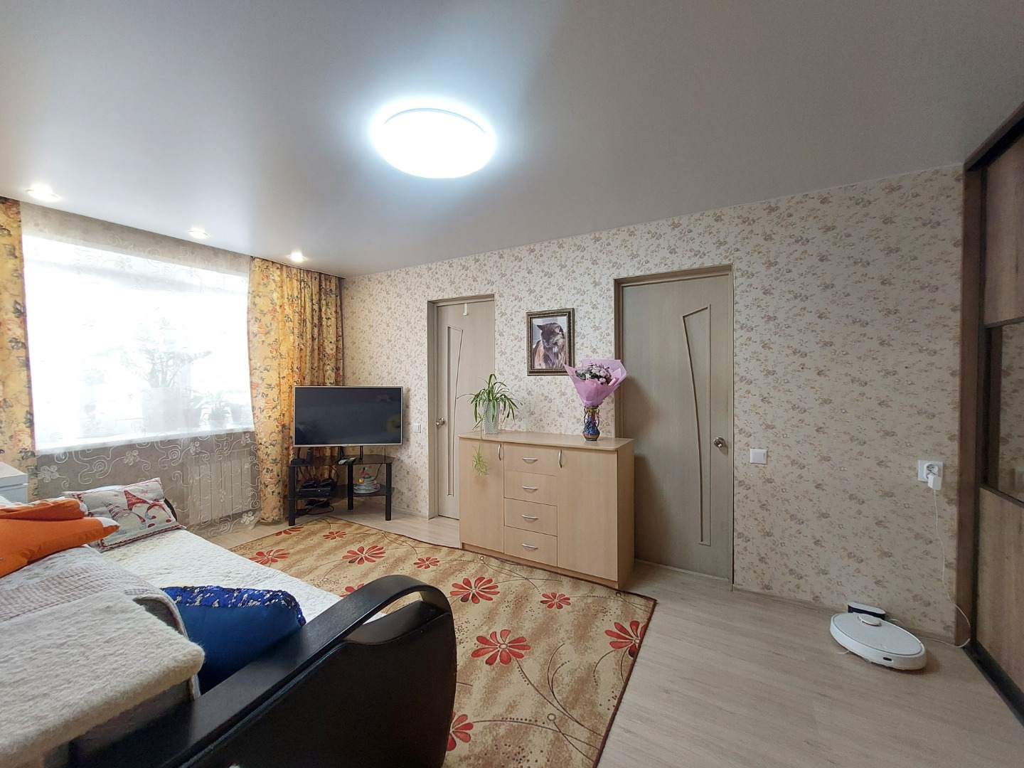 Остаётся функциональный кухонный гарнитур со встроенной посудомоечной машиной, электрической варочной панелью, духовым шкафом и вытяжкой, встроенный шкаф в гостиной, фильтр для воды трёхступенчатый, водонагреватель, шкаф-пенал в ванной комнате.